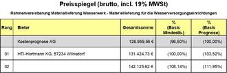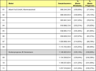 | Bieter | Gesamtsumme (brutto) | % Basis Mindestb. | % Basis Prognose | |