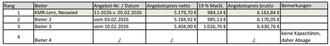 Die Maßnahme wurde Anfang Januar 2026 veröffentlicht. 14 Bieter hatten die Angebotsunterlagen von der Vergabeplattform heruntergeladen. Die Angebotseröffnung erfolgte am 11.02.2026. Der Preisspiegel für eine gemeinsame Vergabe an den mindestfordernden Bieter stellt sich wie folgt dar: