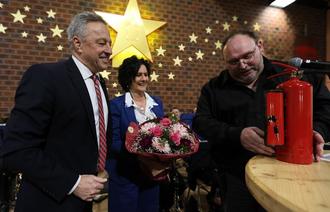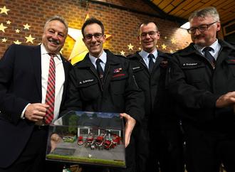 Wir wussten zu jeder Zeit, was wir aneinander haben und wie sehr wir aufeinander vertrauen und uns verlassen können. Danke, Hans-Werner!“ Pierre Fischer wünschte der Landrat einen guten Start und meinte: „Aus Deiner beruflichen Erfahrung in der Kommunal- und Landespolitik und Deinem vielfältigen ehrenamtlichen Engagement bringst Du beste Voraussetzungen mit für das Bürgermeisteramt, außerdem Heimatverbundenheit und Heimatliebe - und jede Menge Gestaltungswillen.“ Es folgte die Ansprache des Vorsitzenden der Kreisgruppe Neuwied des Gemeinde- und Städtebundes Rheinland-Pfalz, Bürgermeister Karsten Fehr. Für die Fraktionen im Rat überbrachte Holger Klein die Wünsche. Für die Ortsgemeinden tat dies die Bonefelder Ortsbürgermeisterin Claudia Runkel und für die Belegschaft trat der Vorsitzende des Personalrates der Verbandsgemeindeverwaltung, Jochen Samland ans Mikrofon. Es folgten die Grußworte der Schulen durch Joachim Fleischer, der Kirchen von Jan Hendrik Otto und Marco Hartmann und der Feuerwehr von Peter Schäfer. Eine besondere Überraschung gab es, als Frank Hachemer, Vizepräsident des Deutschen Feuerwehrverbandes, mit einer Abordnung der Feuerwehr die Bühne betrat. Er überreichte Breithausen die Deutsche Feuerwehr Ehrenmedaille für seine Leistungen für das Feuerwehrwesen. Zum Abschluss bedankte sich Hans-Werner Breithausen für die vielen erfreulichen Wortbeiträge und den Weggefährten während seiner Amtszeit für die gute Zusammenarbeit.