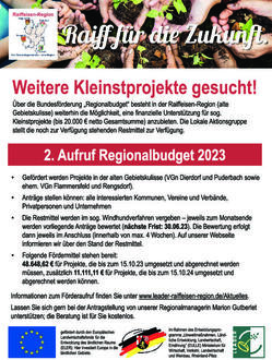 Informationen zum Förderaufruf finden Sie unter www.leader-raiffeisen-region.de/Aktuelles.