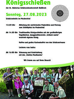 Am Sonntag, 27. August 2023, findet in Roßbach das traditionelle Königsschießen statt. Die Mitglieder der St. Hubertus Schützenbruderschaft treffen sich um 13.30 Uhr an der St. Michael Kirche um die amtierenden Majestäten abzuholen und mit anschließendem Festumzug zum Schießplatz im Masbachtal zu begleiten.