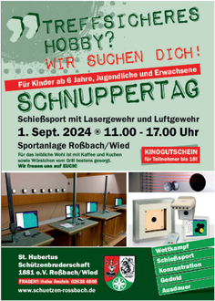 Im letzten Jahr veranstaltete der Verein zum ersten Mal mit großem Erfolg ein Schnupperschießen. Auch in diesem Jahr möchte man interessierten Kindern und Jugendlichen, aber auch Erwachsenen die Möglichkeit geben, die moderne Anlage einmal selbst kennenzulernen und sich im Schießsport auszuprobieren. Für Kinder ab 6 Jahren besteht die Möglichkeit mit einem Lasergewehr den Schießsport kennenzulernen.