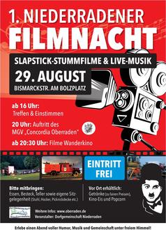 Die Dorfgemeinschaft Niederraden lädt am 29. August 2025 zur 1. Niederradener Filmnacht ein. Das bundesweit bekannte Wanderkino kommt mit seinem historischen Feuerwehrauto auf den Bolzplatz neben dem Dorfgemeinschaftshaus. Gezeigt werden acht kurze Slapstick-Komödien – von Charlie Chaplin über Dick & Doof bis zu Buster Keaton. Wie in alten Zeiten werden die Stummfilme live musikalisch begleitet. Tobias Rank und seine Musikerkollegen schaffen es, Film und Musik zu einer besonderen Einheit zu verbinden und so ein einzigartiges Seh- und Hörerlebnis zu bieten.