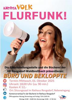 „Flurfunk! Büro und Bekloppte“ ist ein rasanter Ritt durch den zeitgenössischen Irrsinn in Büro und Bürokratie, ein Lach-Parcours der alltäglichen Überforderung und eine Hommage an unsere Bestis im Team.