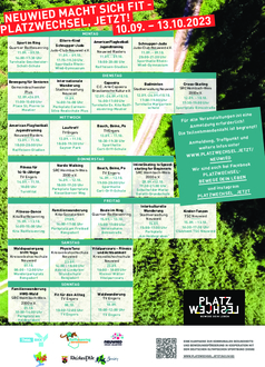 Im September/Oktober 2023 kommt „Platzwechsel - Bewege dein Leben“, eine Kampagne der Team Gesundheit GmbH in Partnerschaft mit dem Deutschen Olympischen Sportbund (DOSB) in Stadt und Kreis Neuwied. Dann gibt es keine Ausreden mehr - denn durch Mitwirkung vieler ortsansässiger Sportvereine und -anbieter, können vom 10.09.2023 bis zum 13.10.2023 zahlreiche spannende Bewegungsangebote kostenlos ausprobiert werden. Hier findet jede:r die passende Bewegungsform.