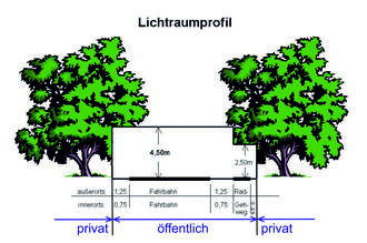Die „dunkle Jahreszeit“ kommt. In dieser Zeit können Straßenleuchten die Gehwege und Straßen nicht ausleuchten, wenn die im Frühjahr/Sommer gewachsenen Bäume und Sträucher bis an die Lichtkuppen neuerlich heranreichen. Hier bitten wir die Grundstückseigentümer im Rahmen der Verkehrssicherung dafür zu sorgen, den jährlichen Grün-Rückschnitt auf ihrem Grundstück dem obigen Lichtraumprofil anzupassen, sodass bei den Straßenleuchten die volle Lichtwirkung erreicht wird. Dadurch wird die Sicht/Einsicht und Verkehrssicherheit der Geh- und Fußwege bzw. der Straßen für alle Verkehrsteilnehmer, sei es als Fußgänger, Radfahrer und Fahrzeugführer deutlich verbessert. Zudem wird auf die notwendige Freihaltung von Sichtfeldern an Einmündungen und Kreuzungen welche die amtlichen Verkehrszeichen verdecken, hingewiesen.