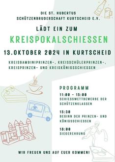 Am Sonntag, 13. Oktober 2024, lädt die St. Hubertus Schützenbruderschaft Kurtscheid zum Kreispokalschießen recht herzlich ein. Die Veranstaltung findet am Schützenhaus Kurtscheid ab 11.00 Uhr statt. Ein spannendes Programm für alle Teilnehmer und Besucher verspricht einen tollen Sonntag.