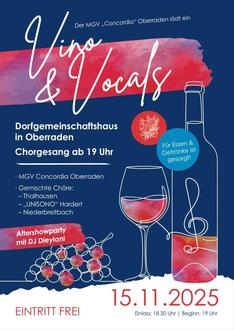 Freunde der guten Musik und des guten Weins sind eingeladen unter dem Motto Vino & Vocals am 15.11.2025 nach Oberraden ins Dorfgemeinschaftshaus zu kommen. Das Weinfest des Männergesangvereins „Concordia“ Oberraden mit Live-Musik und erlesenen Weinen wird um 18:30 Uhr eröffnet. Der Eintritt ist natürlich kostenfrei.
