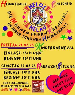 Am 22.02.2025 ab 19:11 Uhr beginnt dann die beliebte Karnevalssitzung für die Großen, unter dem Motto „ Die Möhnen feiern Karneval in ihrer schönen Heimathall“ ist die Ehlscheider Heimathalle wieder liebevoll dekoriert. Die Besucher dürfen sich auf ein stimmungsgeladenes Programm aus Tanzgruppen und Vorträgen freuen. Für ausreichende Stärkung zwischendurch sorgen die Möhnen mit kühlen Getränken sowie deftigem Essen.