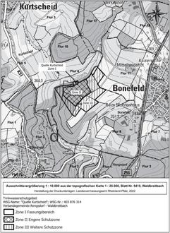 | Das geplante Wasserschutzgebiet liegt zwischen den Ortslagen Bonefeld und Kurtscheid, hat eine Größe von 15,08 ha und wird durch drei Schutzzonen gebildet. Die genaue Lage und Ausdehnung des geplanten Wasserschutzgebietes und der einzelnen Zonen kann der mit dieser Bekanntmachung veröffentlichten Übersichtskarte im Maßstab 1 : 10.000 entnommen werden. |