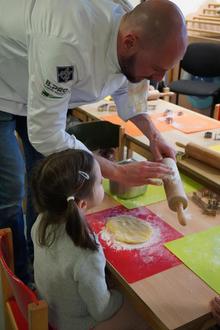 Jürgen Loch und Carsten Severin brachten ausreichend Teig für einen regelrechten Backmarathon mit. Die 80 Kinder der Einrichtung wurden zu begeisterten Bäckern und durften in Kleingruppen beim Plätzchenbacken mithelfen. Jedes Kind erhielt dazu einen Teil des Teigs, den sie auf ihrer mit Mehl bestreuten Arbeitsfläche ausrollten und dann nach eigenem Geschmack ausstachen.