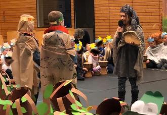 Neben den musikalischen Übungen stellten die Kinder selbst die Masken und Kostüme für die Tiere und die Menschen der Geschichte her. So verbrachten die Kinder eine erlebnisreiche und sehr produktive Projektwoche, die ihren krönenden Abschluss mit der Aufführung und der großartigen Begeisterung des Publikums fand.