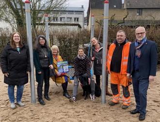 Auf dem Außengelände der städtischen Kita wurde eine Schaukel feierlich übergeben.
