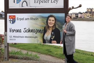 Die 52. Mittelrhein-Weinkönigin Verena Schwager ist ein echtes "Erpeler Mädchen". Ein Zeichen für die Verbundenheit der Ortsgemeinde mit ihrer Weinkönigin sind die beiden neuen Ortseingangsschilder mit Foto der Hoheit, die alle Autofahrer und Autofahrerinnen, die nach oder durch Erpel fahren, willkommen heißen.