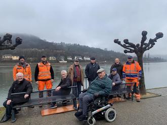 Die Unkeler Rheinpromenade erhält insgesamt 16 neue Ruhebänke und eine Panoramaliege mit Blick auf den Drachenfels. Beim probeweisen Aufstellen der ersten beiden Bänke testete die Unkeler „Rentnerband“ die Bequemlichkeit beim ausgiebigen Probesitzen.