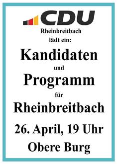 Der CDU-Ortsverband Rheinbreitbach stellt am Freitag, 26. April 2024 um 19 Uhr in der Oberen Burg, Schulstraße 7a, seine Kandidaten und das Programm für die Kommunalwahl 2024 vor