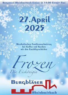 Die Burgbläser laden am 27. April im Bürgersaal der Hans-Dahmen-Halle Rheinbreitbach zum musikalischen Familiennachmittag ein. Bei Kaffee und Kuchen werden kindgerechte Stücke präsentiert. Im Vordergrund steht dabei die Geschichte „Frozen“, welche erzählt und musikalisch begleitet wird. Der Eintritt ist frei. Der Einlass beginnt um 14:00; die Musik um 14:30. Groß und Klein sind herzlich willkommen.