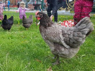 Mit ihrem mobilen Hühnerhaus und einem Gatter sind die Geflügeldamen Marianne, Mathilde, Bärbel und Helga auf ein Wiesenstück im Garten der Kita Regenbogenland gezogen. Sie werden nun vier Wochen lang von den Kindern der Tagesstätte gehegt und gepflegt, rundum versorgt und zwischendrin natürlich auch ausgiebig gestreichelt. Jede Kitagruppe wird eine Woche lang die Versorgung der Tiere übernehmen und gleichzeitig viel über Tierhaltung lernen. Das Legenest im Hühnerstall wird natürlich täglich mit besonderer Spannung inspiziert. Gibt es vielleicht frische Eier für das Frühstück?
