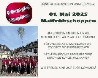 Der JGV Unkel veranstaltet am 01. Mai ab 11:00 Uhr wieder den traditionellen Maifrühschoppen. Es besteht die Möglichkeit das ein oder andere Kaltgetränk zu verzehren. Für das leibliche Wohl sorgt die Foodbox aus Rheinbreitbach. Außerdem gibt es wieder die traditionelle Tombola. Diese findet um 13:30 Uhr statt. Lose dafür können am 01. Mai vor Ort gekauft werden. Darüber hinaus werden Mitglieder des JGVs im Vorfeld durch Unkel gehen und Lose verkaufen.