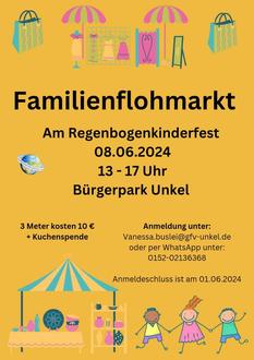 Nach dem großen Erfolg im letzten Jahr veranstaltet der Verein Gemeinsam für Vielfalt e. V. am 8. Juni 2024 wieder einen Familienflohmarkt im Bürgerpark Unkel (ehem. Freibad, Linzer Str. 25). Der Markt richtet sich an private Verkäufer und Käufer und findet wieder parallel zum Regenbogen-Kinderfest von 13 bis 17 Uhr statt. Die Standgebühr für 3m Standlänge beträgt 10 € plus eine Kuchenspende für das Kinderfest. Die Anmeldung für Verkäufer ist bis zum 1. Juni per E-Mail an vanessa.buslei@gfv-unkel.de oder per WhatsApp unter 01520-2136368 möglich. Weitere Informationen unter https://gfv-unkel.de/event/familienflohmarkt24/.
