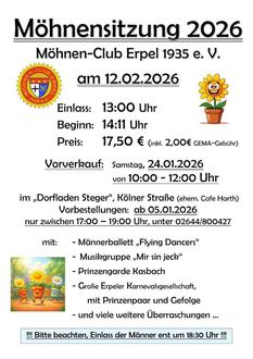 Zur Möhnensitzung 2026 lädt der Möhnen-Club Erpel 1935 e. V. am Weiberfastnacht-Donnerstag, dem 12.02.2026, im Bürgersaal, Heisterer Straße 29, Erpel, ganz herzlich ein.
