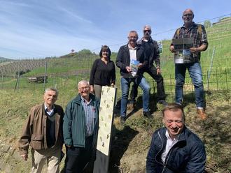 Strahlende Aussichten wenn alle gemeinsam für ein Ziel hinwirken: Die Beteiligten des Förderprojektes „Kulturlandschaftsvermittlungssystem“ Unkel vor der Info-Tafel „Rebsorten-Erklärung“ und den Weinhängen des Elsberg.