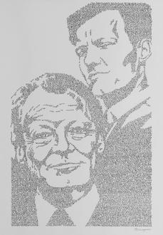 Die in Unkel lebende Künstlerin Barbara Schwinges stellt dem Dialog ihre kalligrafischen Portraits gegenüber. Die Mütter und Väter des Grundgesetzes haben es geschafft, über klare Worte die Normen, Werte und Regeln, die grundlegend für unsere Gesellschaft und Kultur sind, festzuhalten. Barbara Schwinges arbeitet als Kalligrafin daran, die Bedeutung des Wortes und der Persönlichkeit in ihren Portraits durch ihre Formgebung sichtbar zu machen.