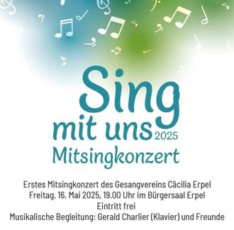 Der Gesangverein Cäcilia Erpel lädt zu einem Mitsingkonzert am 16.05.2025 in den Bürgersaal Erpel, Heisterer Straße 29 ein.