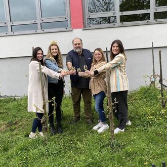 Die ehemaligen Weinmajestäten Andreas, Verena, Janina und Hannah sowie die amtierende Weinkönigin Lara haben kürzlich gemeinsam mit den Schüler:innen der St. Johannes Grundschule den schuleigenen „Weinberg“ erweitert. Diese im Jahr 1997 begonnene Tradition hat der damalige Schulleiter Josef Rönn ins Leben gerufen.