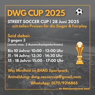 Jetzt anmelden! Schreibt einfach eine E-Mail an dwg.soccercup@gmail.com oder meldet euch per WhatsApp: 0170 9216865.