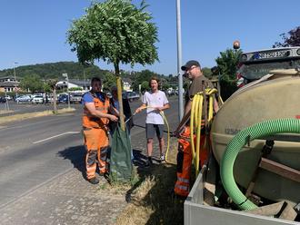 Die Kulturstadt Unkel sorgt auch selbst für die Bewässerung. Regelmäßig setzt der Bau- und Betriebshof seinen Traktor mit einem 2000 Liter fassenden Tank in Bewegung, der mehrfach vollgetankt- und zu den städtischen Grünflächen gezogen wird. Unter anderem werden so auch die städtischen Wassersäcke an den Baumstämmen befüllt. Deren Kapillare sorgen für regelmäßige Feuchtigkeitszufuhr in die Baumwurzeln. Doch diese insgesamt 6000 Liter sind angesichts der konstanten Sonneneinstrahlung mit hohen Temperaturen ein Tropfen auf den heißen Stein.
