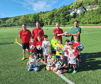 Lorant van Brummen bei der Übergabe der neuen Bälle an die Bambini des FV Erpel. Die Trainer Chris Meyer, Michael Siebert u. Thomas Siebert freuen sich mit den Kleinsten des Vereins.