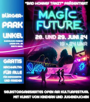 Über zwei Nächte hinweg, von 19 bis 24 Uhr, bespielt „Magic Future“ fünf Bühnen gleichzeitig. Die SchülerInnen der 9. Klasse der „Stefan-Andres-Realschule plus“ leiten das Festival im Rahmen eines berufsvorbereitenden Projekts, unterstützt von 20 professionellen KünstlerInnen von „Bad Honnef tanzt“. Unterstützt durch den Verein „Gemeinsam für Vielfalt“, bietet das Projekt den Jugendlichen die Möglichkeit, eigene Tanzstücke, Musikshows und Installationen zu kreieren und vorzuführen.
