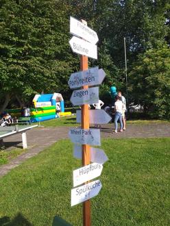 Ein Wegweiser erleichterte die Orientierung beim Regenbogen-Kinderfest.