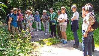 Diplom-Biologin Christiane Guth (links) zeigt den Wanderfreunden des Obst- und Gartenbauvereins (OGV) Rheinbreitbach wie man nützliche heimische Kräuter sicher erkennt.