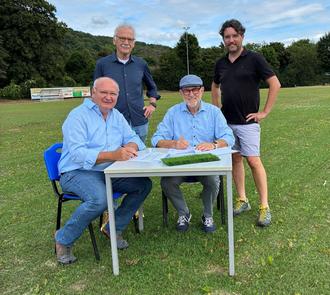 (Kulturstadt Unkel/Gustav Roos): Auf dem Sportplatz wurde nun der neue Pachtvertrag mit der „Stiftung für Jugend, Sport und Integration“ unterschrieben (v. l.n. r. Gerald Muß, Werner Euskirchen, Alfons Mußhoff und Daniel Schmitz)