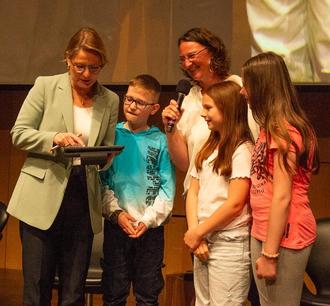 Die Schülerinnen und Schüler des 4.Schuljahres präsentierten zusammen mit ihrer Klassenlehrerin Stefanie Kauferstein und ihrem Schulleiter Jens Heinroth eine interaktive und digitale Lernwörterrallye quer durch den Eröffnungssaal, in die u.a. auch Bildungsministerin Dr. Stefanie Hubig aktiv eingebunden wurde.