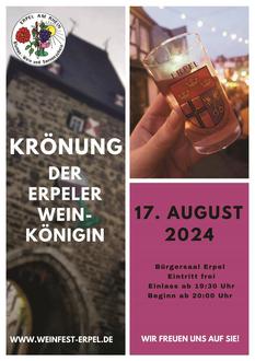 Alle Bürgerinnen und Bürger aus Erpel und der Verbandsgemeinde Unkel, sowie alle Freunde des Erpeler Weinfestes, sind herzlich zur „Krönung“ 2024 in den Bürgersaal Erpel eingeladen um aus erster Hand zu erfahren, wer die Erpeler Weinkönigin 2024/2025 ist.