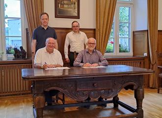 Die drei Stiftungsinitiatoren (Gerald Muß, Jörg Eggenstein und Philipp Selzer) sowie Stadtbürgermeister Alfons Mußhoff bei der Unterzeichnung der Vereinbarung im Alten Ratssaal der Stadt Unkel.