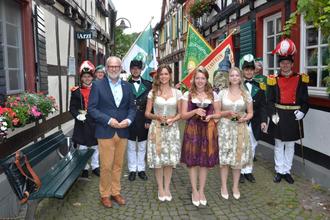Das neue Weintrio Lea Adenauer, Maria Rechmann und Saskia Corvinus freuen sich mit Stadtbürgermeister Alfons Mußhoff und den Junggesellen auf das Wein- und Heimatfest in Unkel.