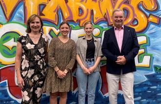 Bürgermeister Karsten Fehr und Ausbilderin Claudia Glos beglückwünschen Kim Schäfer zu ihrer bestandenen Prüfung und heißen die Auszubildende Jule Maihöfer willkommen. Für die vor ihnen liegende Zeit wird viel Erfolg, aber auch viel Freude an ihrer Tätigkeit gewünscht.