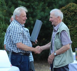 Uwe Werner (links) bedankt sich bei Hartmut Hennig mit einem Präsent.