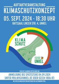 Die Verbandsgemeinde Unkel lädt ihre Bürger herzlich zur Teilnahme an der Auftaktveranstaltung ihres Klimaschutzkonzepts ein. Die Veranstaltung wird am 05. September 2024 um 18:30 Uhr in dem großen Sitzungssaal der Verbandsgemeindeverwaltung Unkel, Linzer Straße 4, stattfinden.
