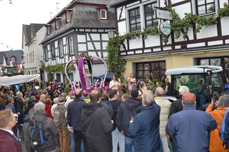 Im Jubiläumsjahr der Gemeinde stand das diesjährige Weinfest in Erpel unter dem Motto "950 Jahre Herrlichkeit Erpel - Geschichte und Geschichten". Am Freitag (16. September) eröffneten gegen Abend die Weinstände für Einheimische und Gäste. Gegen 20 Uhr startete der Fackelzug durch den historischen Ortskern, an dem Kinder, Feuerwehrkameraden, Tambourcorps und natürlich auch Weinkönigin Hannah I. (Roos), Weinprinzessinnen Lea und Anna sowie Bacchus Andreas (Schwager) und Bacchantinnen teilnahmen. Auf dem Festplatz an der katholischen Kirche angekommen, wurde das Weinfest dann offiziell eröffnet. Am Samstagnachmittag bot sich die Gelegenheit, die Sehenswürdigkeiten der Gemeinde bei einer Ortsführung näher kennenzulernen. Am Abend hießen Ortsgemeinde und Weinkönigin zahlreiche eingeladene Weinmajestäten der Umgebung und weitere Ehrengäste willkommen, um gemeinsam gesellige Stunden im Herzen von Erpel zu verleben. Im Mittelpunkt des Festsonntages stand der traditionelle Blumenkorso, der aufgrund der Regenschauer und eher frischen Temperaturen nicht ganz so viel Zuschauer anlockte wie in den Vorjahren, in denen an den umsäumten Straßenrändern kaum ein Durchkommen möglich war. Der Zugweg führte von der Heisterer Straße über die Kölner Straße, Marktplatz, Bahnhofstraße und Bundesstraße 42. Hinter dem reich dekorierten Eröffnungswagen "950 Jahre Herrlichkeit Erpel" folgten die ebenso liebevoll geschmückten Wagen der Gruppierungen, Kita, Schulen und Ortsvereine. Die "Rebläuse" der Kita, "Winzer", "Zwerge" sowie "Ritter und Burgfräulein" der Grundschule zogen die Blicke ebenso auf sich wie die wunderschönen Motivwagen, die unter dem diesjährigen Motto standen und das zeigten, was der Ort ausmacht. Ein Motivwagen war mit dem Erpeler Kähnchen, Basaltsäulen, Zuber, Kiepe und Fass gestaltet. Ein anderer Wagen präsentierte Frontor, Pütz und Neutor. Rathaus und Kirchturm zogen mit Blumen verziert ebenfalls durch den Ort. Das Rathaus erinnerte an die Zeit, als es Sitz des 1. Landrats im Kreis Linz (Preußische Rheinprovinz) war. In der Kirche sollen die Gebeine der Heiligen Drei Könige für eine Nacht aufbewahrt worden sein. Das Frontor gab Einlass für Händler und Bauern an den Markttagen. Bewunderung gab es auch für den Nachen, eine Erinnerung an das Extrem-Hochwasser und an die Sage der Überfahrt der Zwerge. Bestandteil des Umzuges war auch eine Nachbildung der Ludendorff-Brücke und die in den 1950er Jahren aufkommende Idee, einen Sessellift bis auf die Erpeler Ley zu installieren. Neben den bereits Genannten beteiligten sich auch Musikvereine und die KG Unkel (als "Winzer") an dem Festumzug. Das Wetter hielt, sodass sich das Publikum ohne Schirm und ohne nass zu werden das Event anschauen konnte. Nach dem Blumenkorso kamen Majestäten, Jubel-Majestäten und Ehrengäste zum Festakt auf der Bühne im Weindorf zusammen. Der Weinfestmontag dann klang mit dem Bürgerdämmerschoppen gemütlich aus.