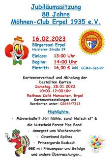 Zu dieser Jubiläumssitzung 2023, lädt der Möhnen-Club Erpel, am Weiberfastnacht-Donnerstag, 16.02.2023, im Bürgersaal, Heisterer Straße 29, Erpel, ganz herzlich ein.