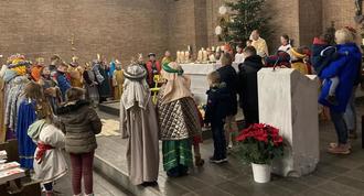 Sternsingerinnen und Sternsinger haben sich bei der Abschluss-Messe der Aktion Dreikönigssingen in der Rheinbreitbacher Kirche um den Altar versammelt.