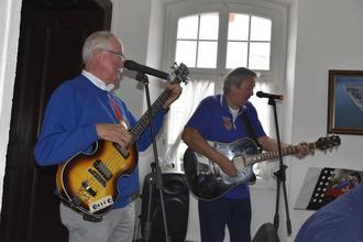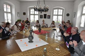 Anlässlich des Erpeler Weinfestes hat die Ortsgemeinde Erpel die diesjährigen Weinmajestäten mitsamt Bacchus und Bachantinnen zum Empfang in das Rathaus eingeladen. Mit dabei waren auch die Jubiläumsweinkönigin Anja Zimmermann, Vertreter des Arbeitskreises Erpeler Vereine und Musiker der Volle Blaos. Als "WiSu" unterhielten Günter Witten und Bernd Süßmilch mit Gitarre und Gesang. Nach dem Begrüßungslied "Ein Prosit auf die Gemütlichkeit" und den Begrüßungsworten sprach Ortsbürgermeister Günter Hirzmann allen einen großen Dank aus. "Sie alle tragen maßgeblich zum Erfolg des Erpeler Weinfestes bei." Das Motto des Blumenkorsos lautete "950 Jahre Herrlichkeit Erpel - Geschichte und Geschichten". Viele hätten sich auch beim Blumenkorso und auch bei den Jubiläumsveranstaltungen in diesem Jahr eingebracht. "Auch ihnen gebührt großer Dank", sagte Hirzmann. Weinkönigin Hannah Roos, die von ihren Prinzessinnen Lea Marie Warnke und Anna Wiemer begleitet wurde, freute sich auf den Blumenkorso, der wenige Stunden später am Nachmittag stattfand (Wochenkurier berichtete). "Ich bin froh, dass wir endlich wieder ein normales Winzerfest feiern können. Ich hoffe, dass das Wetter hält, wenn sich der Korso in Bewegung setzt", sagte Hannah. Das Wochenende gestaltete sich eher regnerisch, aber die Erpeler hatten Glück. Viele Besucher konnten sich dem Umzug trockenen Fußes anschauen. Bei dem Rathausempfang wurde ebenfalls an Geschichte und Geschichten erinnern, so manches war zum Schmunzeln. Karel Harmsen von der Musikgruppe Volle Blaos bekräftigte, dass er und seine Musiker sich in Erpel zuhause fühlten. Die Gruppe sei nun zum 33. Mal hier in Erpel, um das Winzerfest mit Blasmusik zu verschönern. Harmsen schenkte Hirzmann ein Glöckchen, das in Zukunft die Stärke des Windes anzeige. "Es ist wohl die einzige Glocke, die in Erpel schwingen darf", sagte Harmsen augenzwinkernd. So manches Brauchtum wie zum Beispiel Festumzüge werde durch immer schärfere Verordnungen erschwert, klangen im Rathaus auch ernstere Töne an. Hier hofften alle, dass die Politik für Erleichterung sorgen werde. Auch wurde bei dem Empfang ein Abschied verkündet: Bacchus Andreas Schwager teilte mit, dass er sein Amt nach zehn Jahren niederlegt. Er wolle zusammen mit seiner Familie wieder ein ganz normales Winzerfest ohne offizielle Termine feiern. "Ich bin stolz darauf, dass mich meine Familie so toll unterstützt", sagte Schwager.