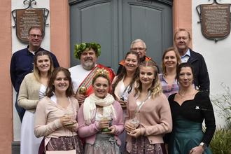 Anlässlich des Erpeler Weinfestes hat die Ortsgemeinde Erpel die Weinmajestäten mitsamt Bacchus und Bachantinnen zum Empfang in das Rathaus eingeladen. Mit dabei waren auch die Jubiläumsweinkönigin Anja Zimmermann, Vertreter des Arbeitskreises Erpeler Vereine und Musiker der Volle Blaos.