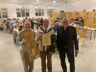 Der OGV-Vorsitzende Norbert Buchbender (rechts) und sein Vize Josef Weich (links) ehren Peter-Josef Euskirchen als vorbildlichen Gärtner und Alleinunterhalter, der seit Jahrzehnten für Schwung und gute Laune beim tradtitonsreichen Erntedankfest sorgt.