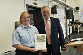 Theresia Menden erhält die Ernennungsurkunde von Karsten Fehr.